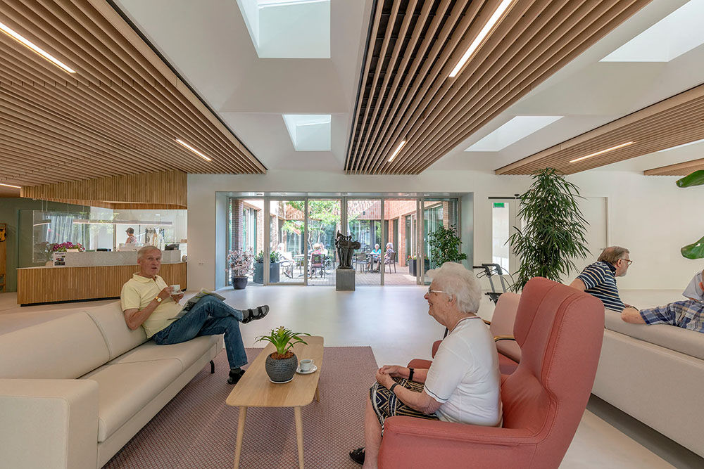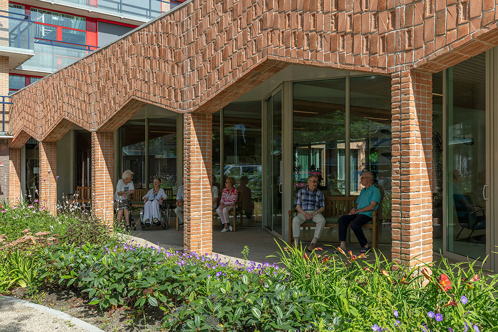 De foyer was al in gebruik genomen, maar nu is ook de voortuin van Schouwenhove helemaal af. Het groen staat er al prachtig bij, de bankjes staan klaar en de zon schijnt. Wat een fijn thuiskomen voor bewoners en mooi welkom voor bezoek! Fotograaf Marcel van den Burg ging op bezoek en zag hoe de bewoners genieten van de groene voortuin en de patio naast de foyer.