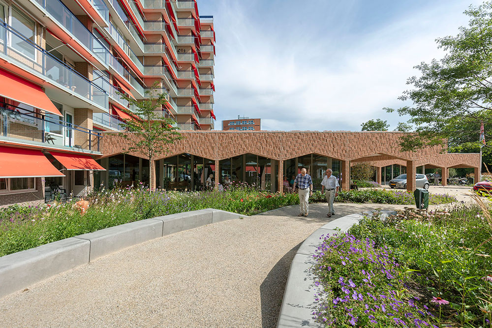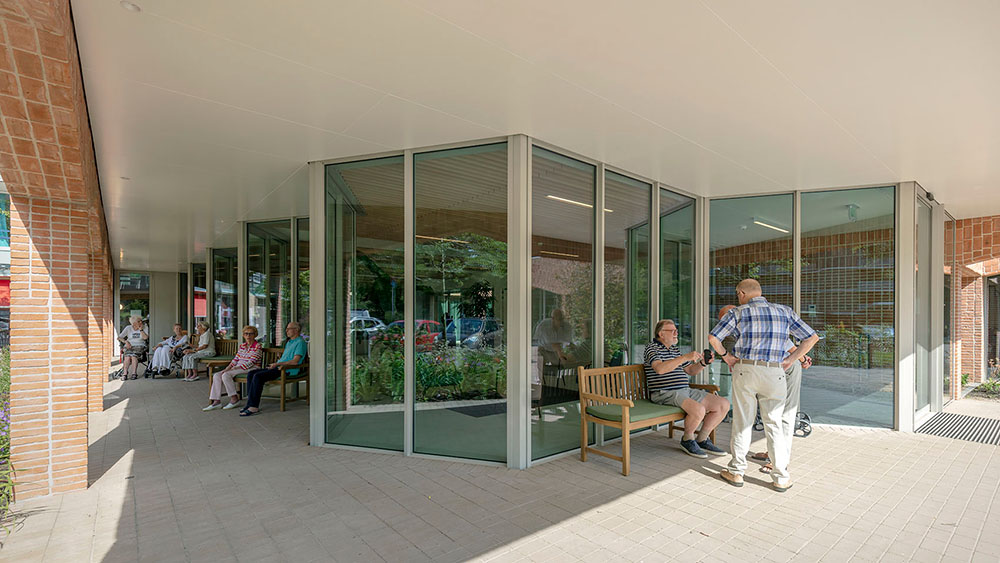 Het gebied voor het gebouw, waardoor zowel de hoofdentree als de fietsenberging te bereiken is, is groener en vriendelijker geworden, met ruimte om even te wandelen of van de zon te genieten. De kloostergang direct aan de foyer biedt de bewoners een beschutte plek, uit de wind en de regen, waar ze altijd even kunnen genieten van de tuin.